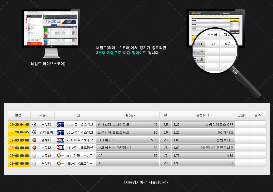 많은경기들을 수동으로 마감치는것도 보통일인가요 저희 킹솔루션은 네임드(라이브스코어) 기준으로 마감처리하며 경기종료 후 3분 후 일괄적으로 자동마감 합니다.